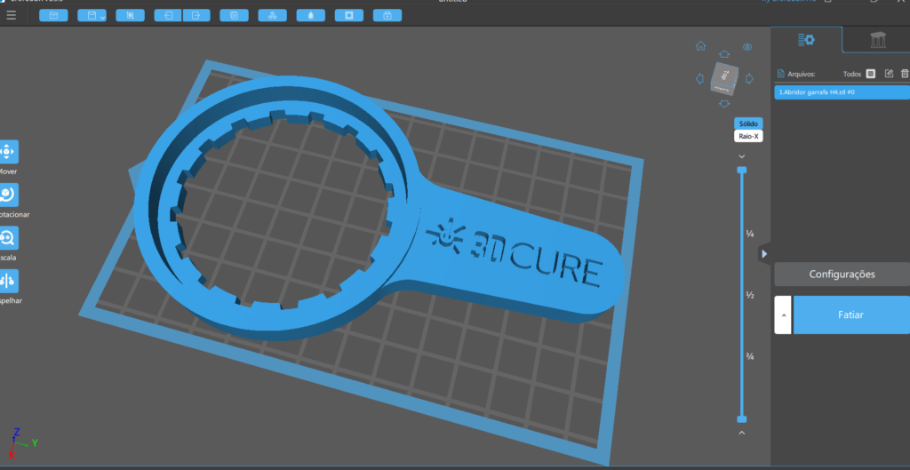 Abra o arquivo em seu fatiador de preferência e posicione o abridor diretamente na plataforma de impressão, sem colocar suportes. Você deverá usar tempo de exposição nas camadas de base bem baixo para conseguir remover facilmente a peça da plataforma.