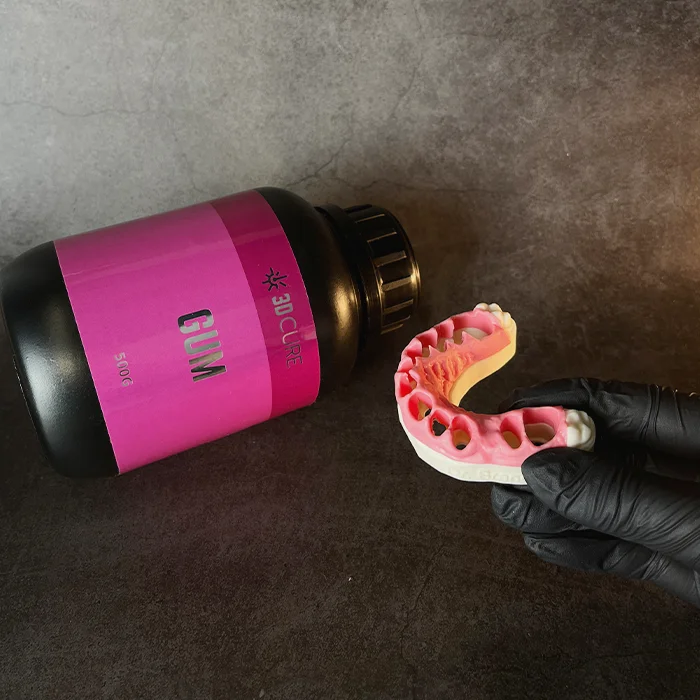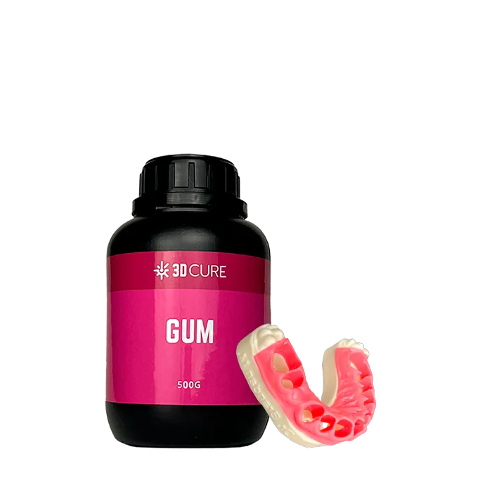 A Resina 3D Cure GUM é uma resina flexível para prótese dentaria desenvolvida para o mercado de odontologia. Ela é indicada para impressão 3D de modelos gengivais funcionais em um fluxo de trabalho digital em conjunto com outros modelos e troqueis.