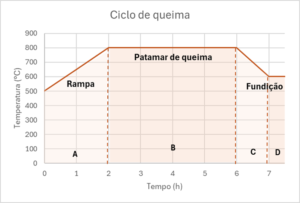 Coloque o frasco em uma temperatura de 500 °C e realize uma rampa de 2 horas para atingir 800 °C e, ao atingir essa temperatura, mantenha por 4 horas. Ajuste a duração conforme o número e volume do frasco e espessura dos trabalhos. Reduza até a temperatura necessária de fundição e mantenha por meia hora. Realize a inclusão do metal como de costume.