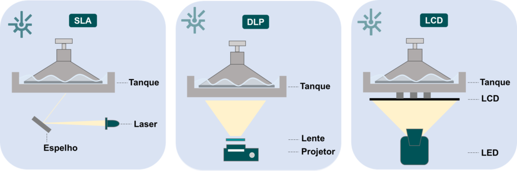 Diferença entre as tecnologias SLA, DLP e LCD.